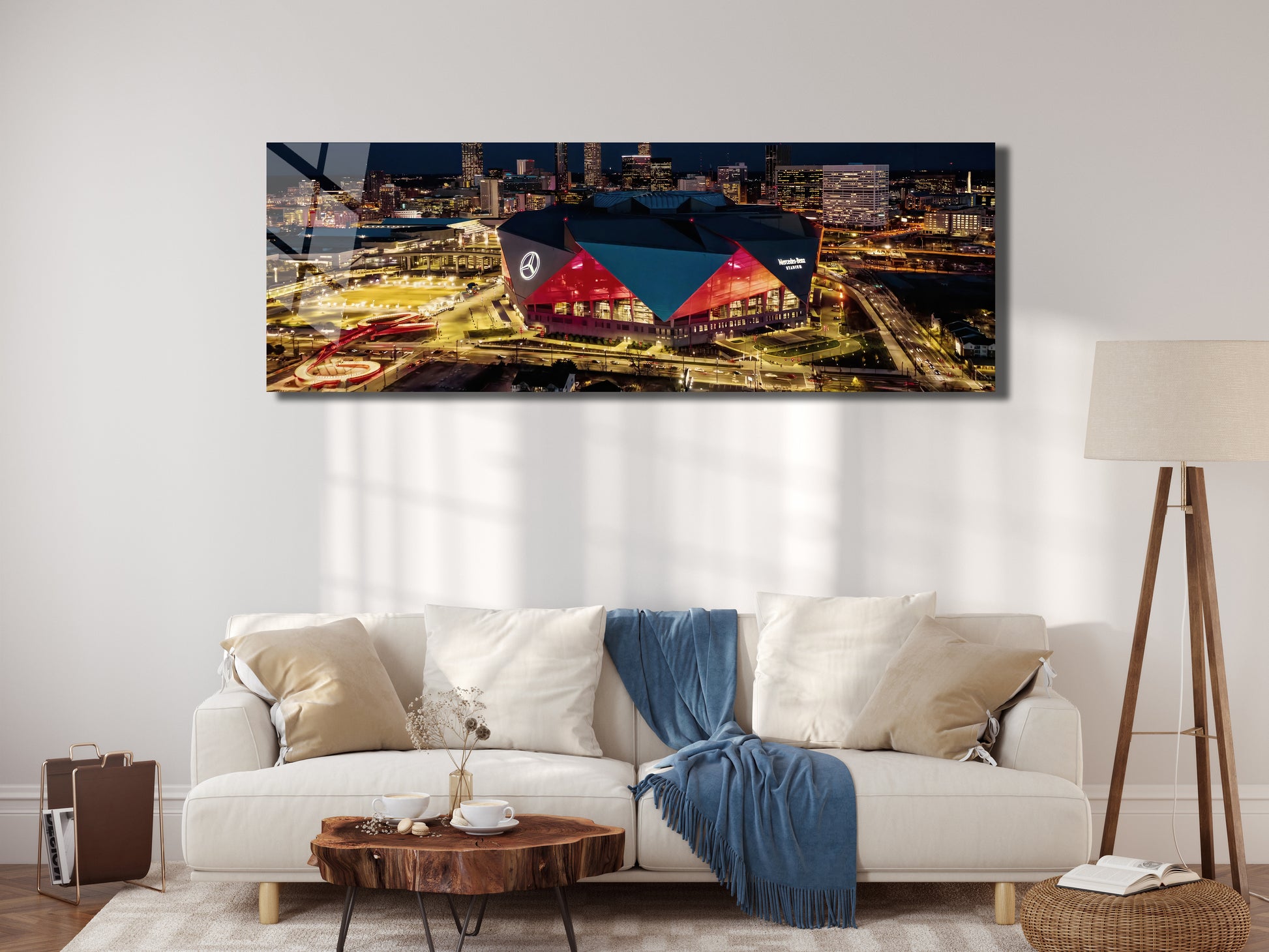 Own a piece of ATL after dark. This panoramic aluminum metal print captures Atlanta’s skyline shining around the stadium’s striking red glow—clean lines, city lights, and big-game energy from above. Printed directly onto premium aluminum, it delivers vivid color, razor-sharp detail, and a sleek frameless profile that appears to “float” off the wall. Durable, lightweight, and ready to hang—perfect for a fan cave, home theater, office, or modern living room.