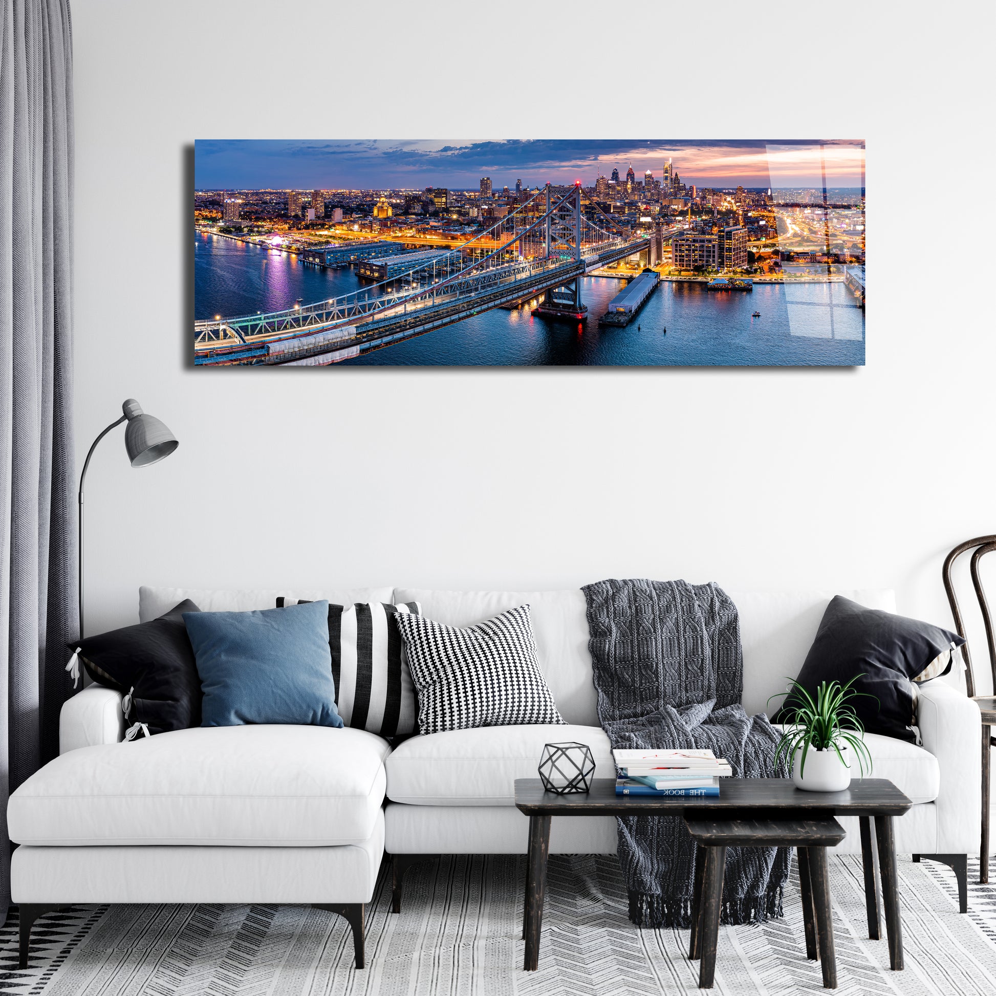 Bring Philly’s riverfront glow into your space. This panoramic aluminum metal print captures the Benjamin Franklin Bridge leading into a sparkling Philadelphia skyline at blue hour—rich blues, warm city lights, and glassy water reflections. Printed directly on premium aluminum, it delivers vivid color, razor-sharp detail, and a sleek, frameless profile that “floats” off the wall. Durable and lightweight, it’s perfect for modern living rooms, offices, and statement hallways. Arrives ready to hang.